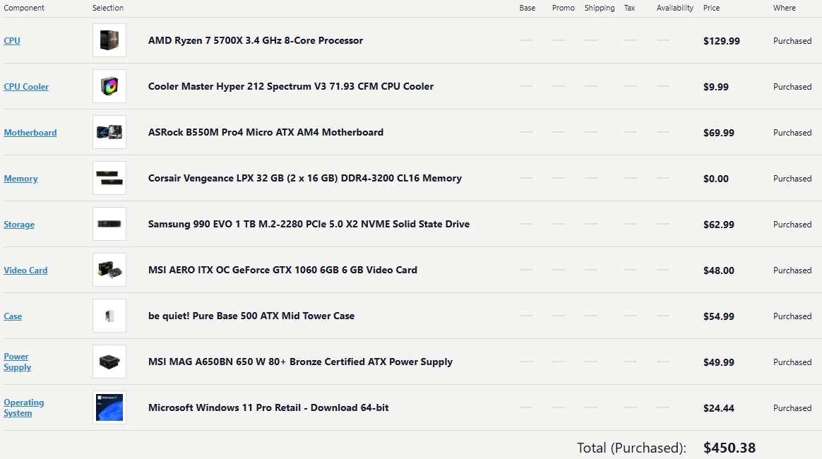 Total PC cost = $450.38 https://pcpartpicker.com/list/zxjZ2x